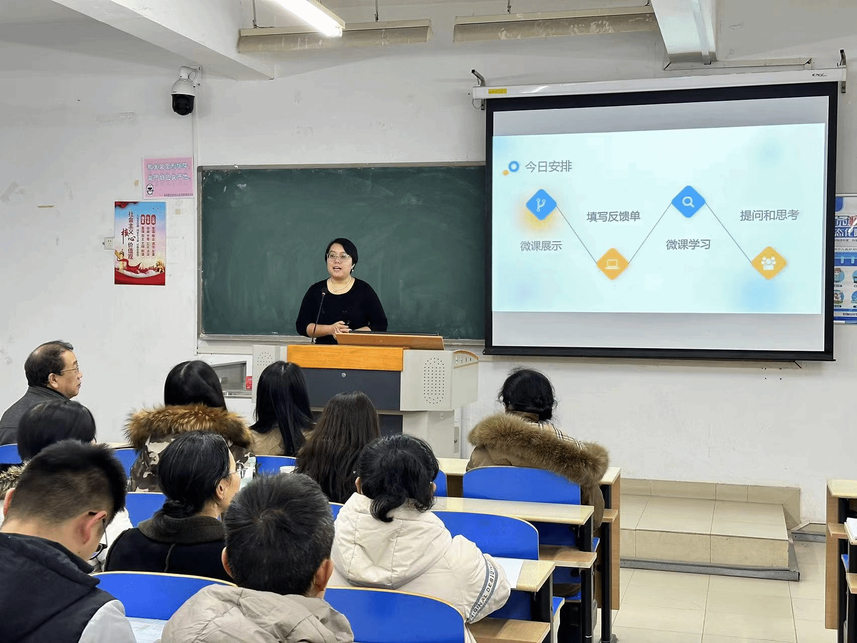 本次研讨会由外国语学院副院长、天津学院ISW首期培训毕业学员张绚主持。研讨会按照微课展示、填写反馈单、微课学习和提问与思考四个环节展开。首先外国语学院张苗老师做了微课展示,用十分钟的时长从教学目标、导入、词汇、课文、互动、归纳、作业几个方面展现了教学环节完整的一堂课。老师们纷纷发言,对张苗的微课给出评价和建议。张绚、李文红和米岩分别从教学理论、结构性和非结构性等方面做了专业点评。