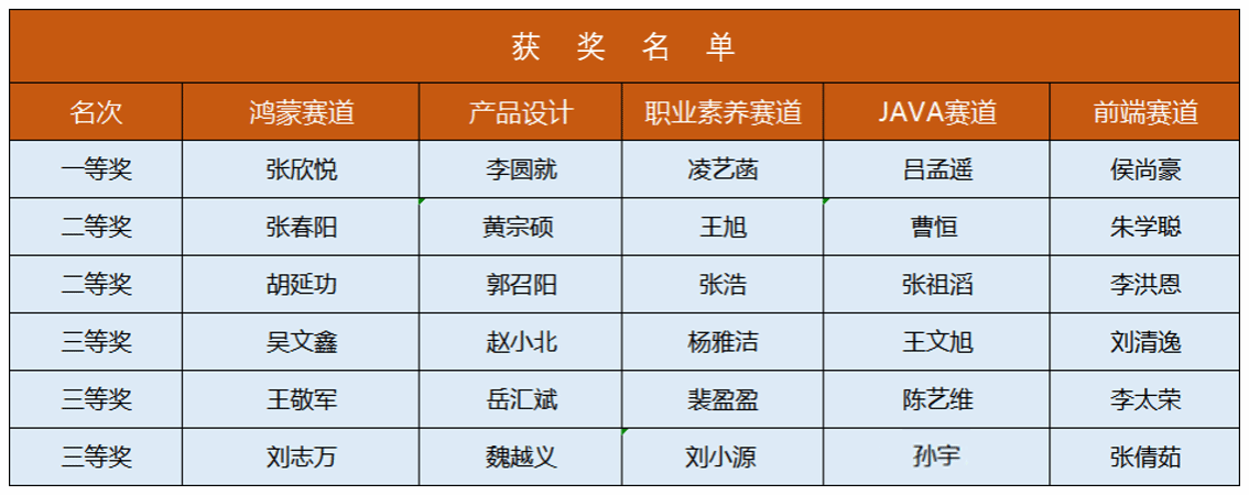 “中软杯”技能大赛共有鸿蒙赛道、产品设计赛道、职业素养赛道、JAVA赛道、前端赛道等5大赛道,本次共评出一等奖5项、二等奖10项、三等奖15项。
