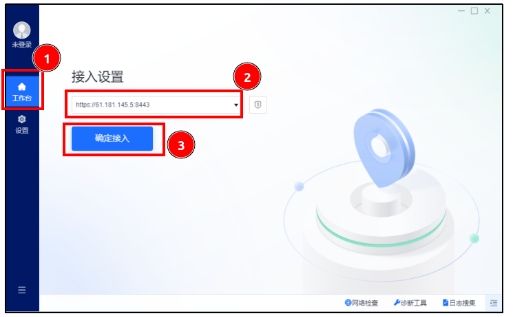 客户端软件安装完毕后。请运行软件,在接入设置框中填入:https://61.181.145.5:8443 然后点击“确定接入”。