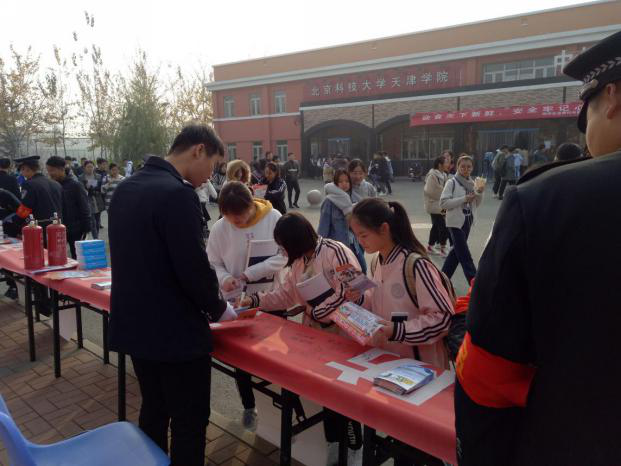 活动现场保卫处工作人员和京津新城派出所警官为过往师生发放精心准备的各种宣传材料,耐心细致的讲解展示消防救援器材和灭火器使用方法,常见电信诈骗手法;现场师生反响热烈,纷纷在宣传横幅上签名,部分学生还留了安全寄语。