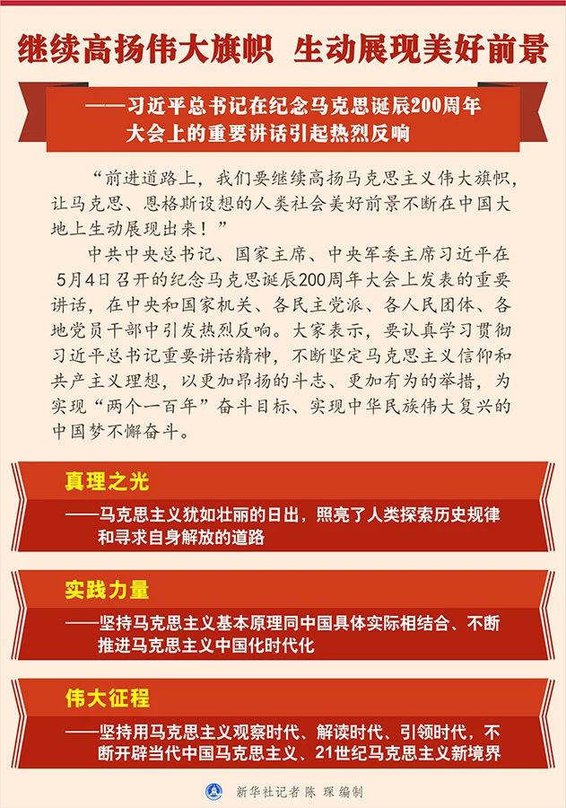 中共中央总书记、国家主席、中央军委主席习近平在5月4日召开的纪念马克思诞辰200周年大会上发表的重要讲话,在中央和国家机关、各民主党派、各人民团体、各地党员干部中引发热烈反响。大家表示,要认真学习贯彻习近平总书记重要讲话精神,不断坚定马克思主义信仰和共产主义理想,以更加昂扬的斗志、更加有为的举措,为实现“两个一百年”奋斗目标、实现中华民族伟大复兴的中国梦不懈奋斗。