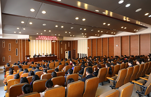 党委书记王斌传达了中纪委七次全会精神和习近平总书记重要讲话精神、北京科技大学2017年党风廉政建设工作会议精神、天津市教育系统2017年党风廉政建设工作会议和天津市教育系统不作为不担当问题专项治理推动会有关精神,并对学院党风廉政建设进行部署。他强调学院将严格落实天津市教育两委和北京科技大学党委有关部署的要求,扎扎实实开展党风廉政建设和反腐败工作,认真做好专项治理工作,为营造良好的校园政治生态和育人环境做出更大的贡献。