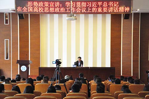 3月22日,学院党委书记王斌在理工馆学术报告厅为学生做形势政策宣讲,主题为《学习贯彻习近平总书记在全国高校思想政治工作会议上的重要讲话精神》,学生党支部书记、学生党员及学生干部120余人到场聆听。