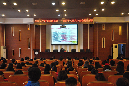 为深入学习贯彻十八届六中全会精神,推进“两学一做”学习教育深入开展,学院于11月10日下午邀请中共天津市委党校党史党建教研部副主任贾锡萍教授在理工馆学术报告厅作“全面从严治党的新部署——党的十八届六中全会精神解读”专题报告。学院党委中心组成员、师生党员、入党积极分子等参加了报告会。