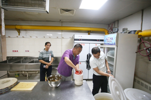 淡春江处长首先对本次督查的主要内容进行介绍,强调市委、市政府领导对食品安全工作高度重视,希望借本次督查机会,使天津市各高校食品安全卫生的整体状况有大幅提升。随后,学院领导就学院积极贯彻落实市教工委、市教委联合下发的《关于天津市教育系统食品安全大检查工作方案的通知》精神,加强食品卫生安全管理及进行自查整改的情况,向检查组作了简要汇报。汇报后,检查组以现场组和资料组两种方式开展检查。现场组先后到学生一食堂、学生东区食堂的后厨、消毒间、面点间、分餐间、主、副食库房和超市等场所进行了现场检查。资料组在行政楼302会议室按照督查表内容逐项核验和检查,对食堂经营资质证书、管理制度完善及落实情况,工作人员健康证、大宗物资平台采购记录、食品安全责任书、台账等内容进行了检查。