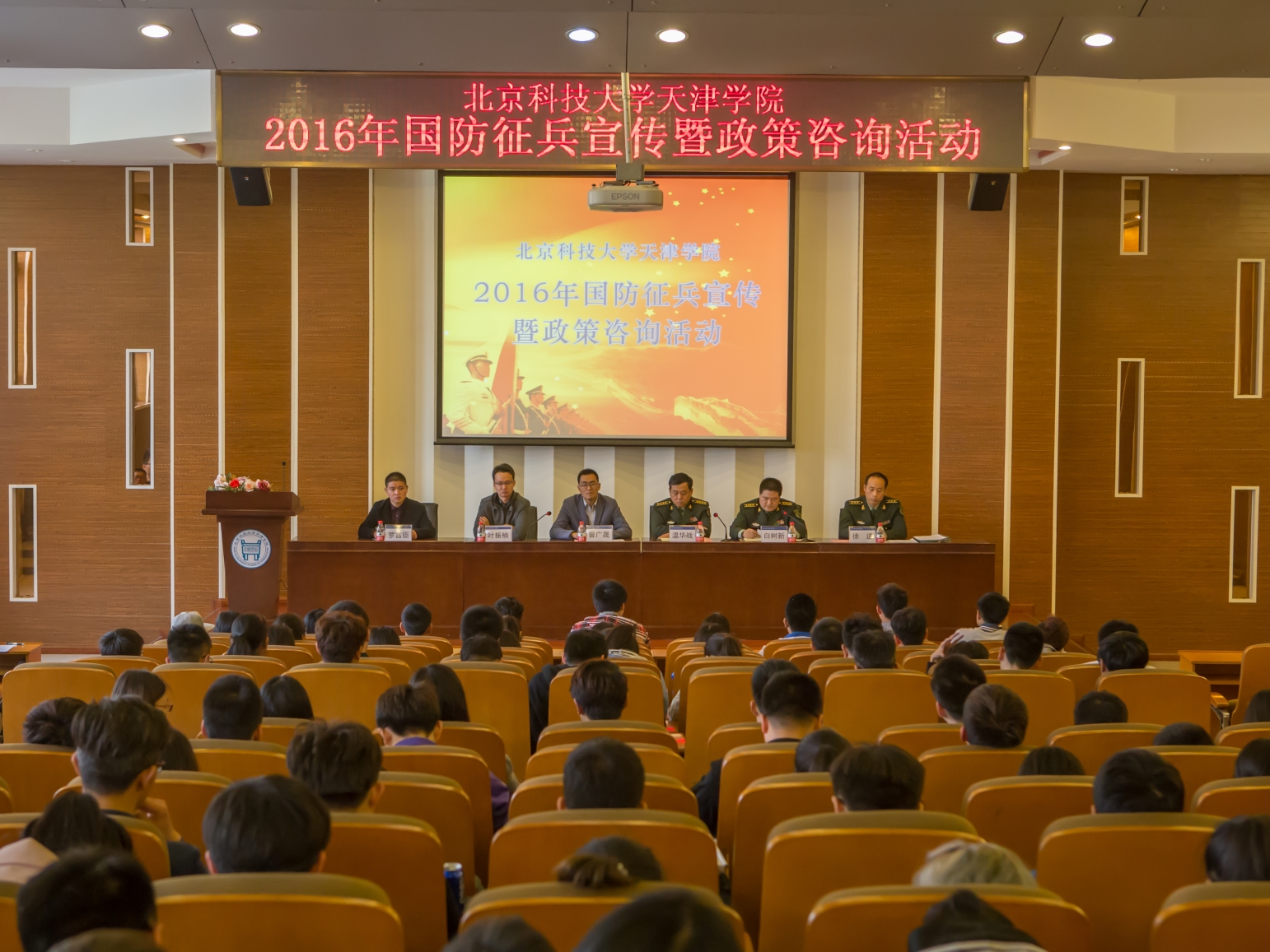 2016年4月13日下午4:00,beat3652016年国防征兵宣传暨政策咨询活动在理工图书馆学术报告厅举行。宝坻区委常委、区武装部部长温华战,区武装部政委白树新,副部长徐进,英国beat365官方网站副院长曾广晟,党委副书记叶振楠出席本次活动。