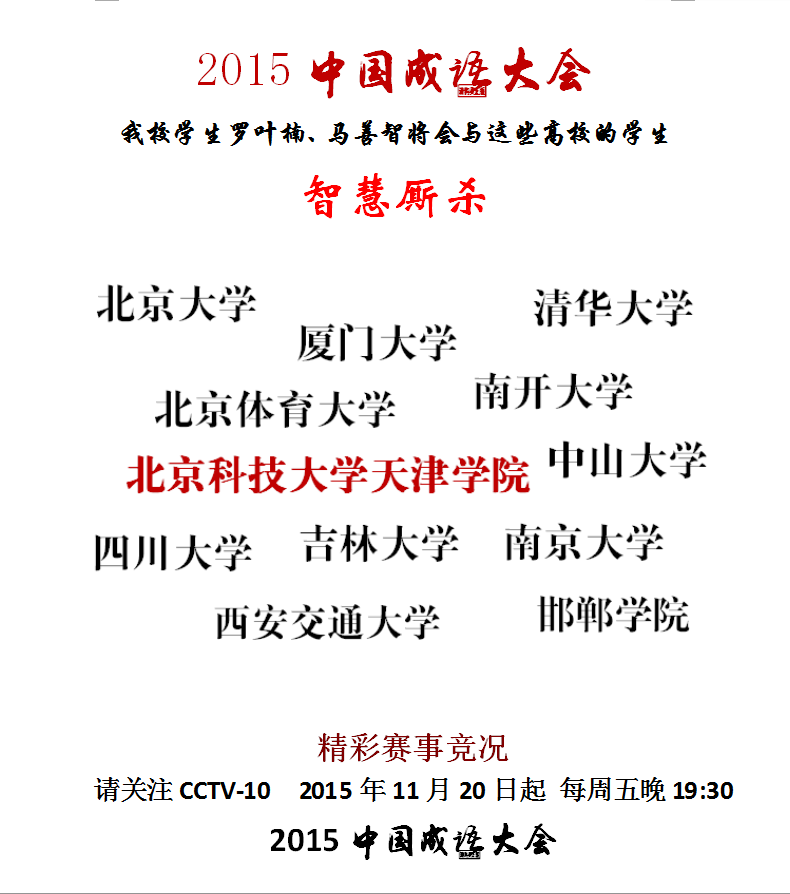 前言:中国成语大会是由中国汉字语言委员会主办,中央电视台承办的一档大型文化综艺节目,自2014年第一期开播以来就受到社会各界的广泛好评。beat365学生罗叶楠、马善智是成语大会的忠实粉丝,自第一季成语大会播出后,就开始自学成语、研究典故,经过充分准备,并经过全国海选,两人于今年10月21日来到古城邯郸参与全国24强的角逐。