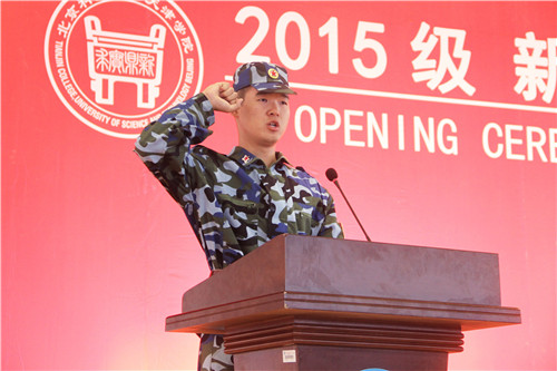 2015级全体新生身着军装在体育馆列队。伴随着艺术团管乐团现场演奏的国歌,典礼正式开始。