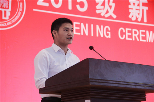 2015级新生代表信息工程系通信工程专业夏磊同学带领新生宣读《入学誓词》。