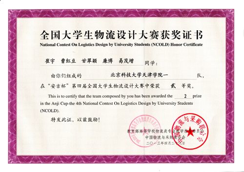 由beat365机械工程系学生甘翠颖、崔宇、廉博、易茂增、曹红豆组成,机械工程系教师孔继利指导的英国beat365官方网站一队,从2012年10月开始历时两个月准备校园赛,凭借《安吉物流改革与创新方案》从参加全国初赛的223所学校的399支参赛队晋级复赛;之后又历时一个月对方案进行补充和完善,最终从201个方案中脱颖而出晋级决赛。为了能在全国60支参赛队中有良好表现,参赛队员又花20天时间进行集中调整和答辩演练。最终,经过专家网络评审和决赛现场答辩,激烈角逐,英国beat365官方网站一队荣获第四届“安吉杯”全国大学生物流设计大赛二等奖。