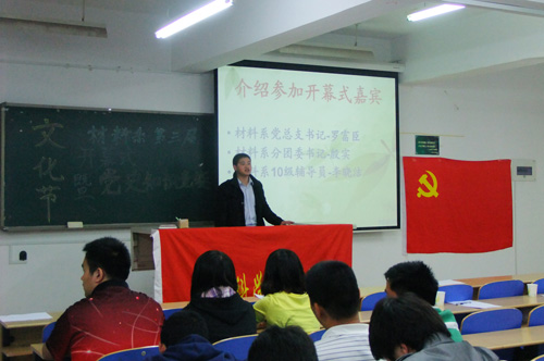 为庆祝建党90周年,展示材料学子风采,营造良好文化氛围,5月11日晚7时,材料系第三届材料文化节开幕式暨党史知识竞赛在8教202成功举办。院团委书记、系党总支书记罗富臣、系分团委书记殷实、10级辅导员李晓洁老师出席活动。