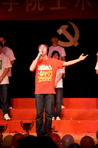 5个班的演唱结束后,开始了中场互动环节——“我爱记歌词”。土木工程系2010级各专业班级选出代表参加红歌接唱游戏。曲曲老歌带领着现场观众回到了那个激情燃烧的岁月,回到了革命年代。