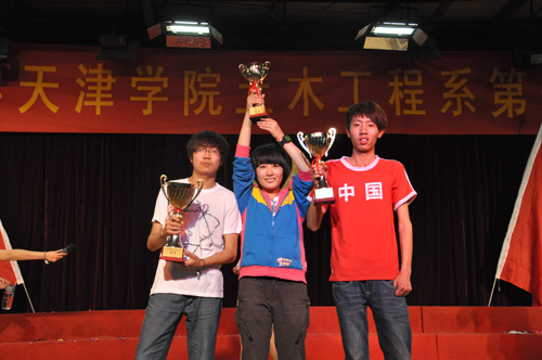 土木工程(造价管理)1001班获得“最佳风尚奖”、土木工程(造价管理)1005班获得“最佳组织奖”、土木工程(造价管理)1002班获得“最佳团体奖”、土木工程(造价管理)1007班获得“奉献精神奖”、土木工程(房地产开发与管理)1002班获得“爱国精神奖”、土木工程(房地产开发与管理)1001班获得“红歌精神奖”。本届大赛三等奖由造价1003班获得、土木工程(造价管理)1004班获得二等奖、土木工程(造价管理)1006班摘得桂冠。