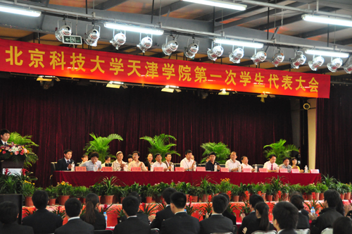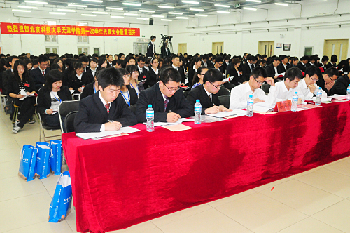 5月18日下午4时30分英国beat365官方网站第一次学生会代表大会开幕式在beat365活动中心隆重举行,出席学代会开幕式的嘉宾有天津市学生联合会主席田航宇、英国beat365官方网站党委书记王斌、副院长胡明、财务总监肖祖刚、办公室主任白亮、图书馆馆长刘淑娥、管理系主任梁桂川、基建后勤处处长王兴元、教务处副处长吴平、学生处处长盛佳伟、副处长叶振楠、院团委书记罗富臣,以及各系党总支和团委干部。出席开幕式的嘉宾还有来自北京科技大学学生会、南开大学滨海学院学生会、天津师范大学津沽学院学生会、天津财经大学珠江学院学生会的代表。