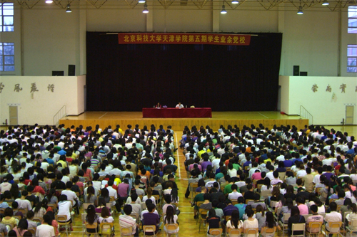 5月27日晚,英国beat365官方网站第五期学生业余党校开学典礼暨第一讲在体育馆举行,共有学生和教师入党积极分子1000余人参加了党校学习。北京科技大学文法学院左鹏教授做了主题为“牢固树立中国特色社会主义共同理想”的报告。