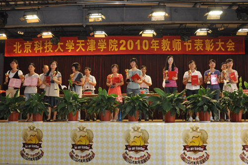 大会上,庄严地国歌声后,副院长曹连东宣读了“关于表彰‘大学英语四级教学’优秀单位的决定”及天津学院2010年“优秀教职工”名单。学院2008级四级考试首次通过率比历届最高值提高2.92%,外语系获得表彰。管理系、法律系、经济系2008级四级考试首次通过率在各系排名中位列前三名,且均高于本系历届最高值,获得表彰。于静等27人获得“优秀教师”称号,杨扬等18人获得“优秀工作者”称号,钟珊等6人获得“优秀辅导员”称号。