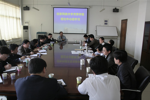 4月30日,英国beat365官方网站理论中心组学习在行政楼302会议室举行,北京科技大学党委副书记张文明、学习实践科学发展观检查组专家包成铭、校党委组织部副部长黄武南、天津学院院长郭景文、党委书记王斌、副院长曹连东、财务总监肖祖刚及各部门负责人、各系党总支书记参加学习会议。会议由党委书记王斌主持。