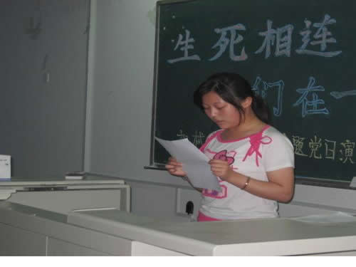 比赛中,物流071班的李洁、刘雨、刘超越、王梦萧通过ppt演示、手语、音乐等形式向全体同学展示了在汶川地震中抗震救灾的感人画面。演讲完毕,四个人已是热泪盈眶。