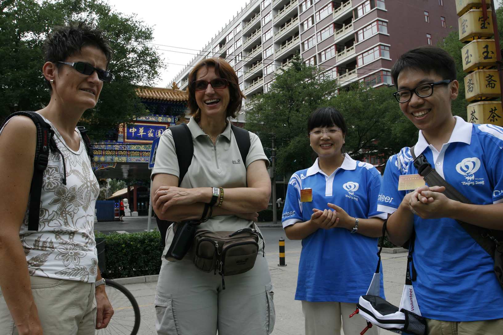 两名外国游客得到志愿者的帮助后,怀着感激之情与志愿者合影留念。