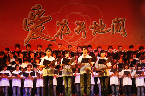 祈福活动结束,学院领导带领全场师生高唱《歌唱祖国》,真情永存,爱心无价