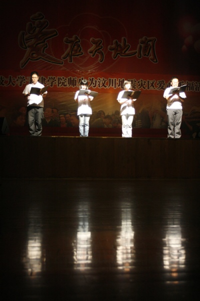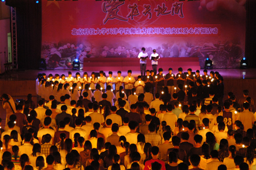 活动始终贯穿着沉痛、坚定、信念的基调,到场广大师生手持白色蜡烛肃然起立,全体工作人员身着印有“爱在天地间”字样的统一T恤,手持白色蜡烛在台前摆成“心”型,整个体育馆跃动着闪闪烛光,全场上下为四川汶川地震死难同胞默哀三分钟。艺术团成员将代表祝福的黄丝带系在手腕,默默为华夏同胞祈福。
