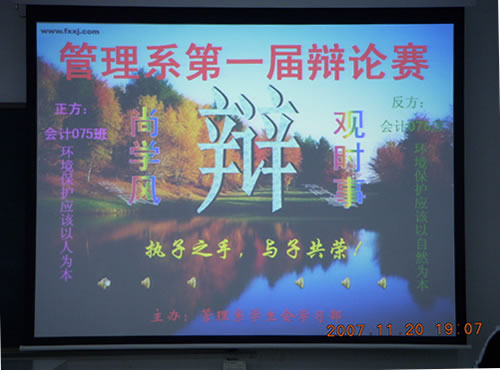 第一场比赛以保护环境为主题,辩论双方队伍为会计0705班与会计0706班,正方会计0705班以“环境保护应该以人为本”为辩论观点,从人类自身对环境影响的角度,阐述了保护环境应着重从人类自身出发;反方会计0706班则以“环境保护应该以自然为本”为题进行了积极的辩证,认为在保护环境的过程中,相对于人类自身,自然因素发挥着更大的作用。