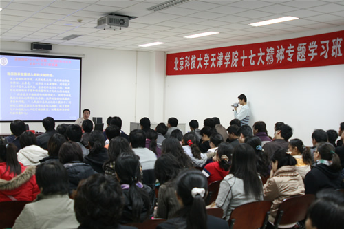 11月29日下午,beat365在图书馆会议室举行院、处级十七大精神专题学习班首讲,北京科技大学党委书记罗维东莅临并作十七大辅导报告,首讲由北京科技大学校长助理、天津学院院长张文明教授主持。