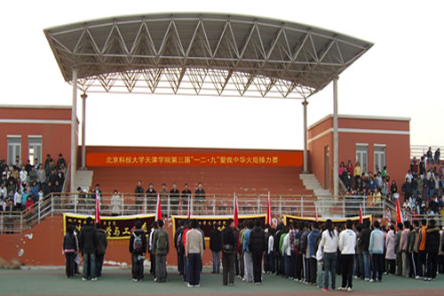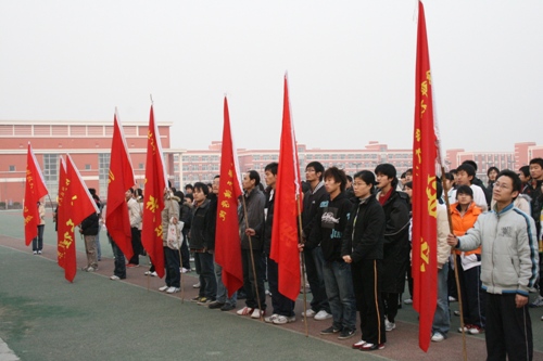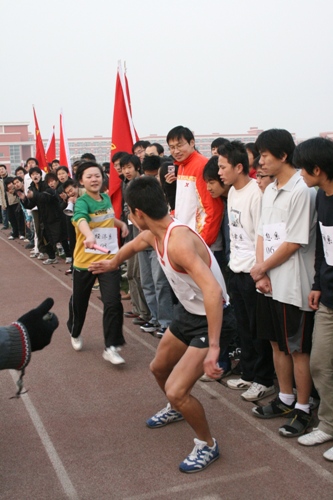 下午4:00,北京科技大学校长助理、天津学院院长张文明教授宣布比赛正式开始。此次“一二•九——爱我中华”火炬接力赛由来自学院8个系的8支参赛队伍参加,每支队伍十人参赛。根据赛程,各系党总支书记或分团委书记负责完成赛段前50米,之后接力棒交给各系代表队队员,围绕学院操场及行政楼一圈后交给下一位队员。