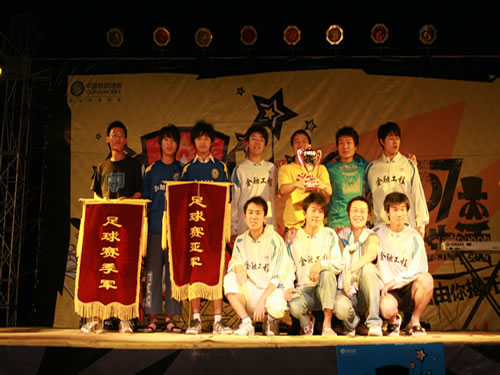 比赛结束后,足球协会在西区篮球场举行了庆祝晚会。晚会现场节目精彩、气氛火爆。其中,为第二届足球赛冠军队颁奖环节将晚会带入高潮,足球协会主席阴守信分别为冠军05级金融代表队、亚军05级国贸代表队和季军05级法学代表队颁奖。