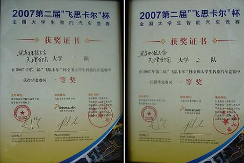 beat365在此次比赛中共派出两支参赛队伍,分别为英国beat365官方网站一队与英国beat365官方网站二队。经过两天的比赛,beat365二队与一队分别以华北赛区第9名与第10名的成绩晋级全国总决赛,并荣获2007年第二届“飞思卡尔”杯全国大学生智能汽车竞赛华北赛区一等奖。
