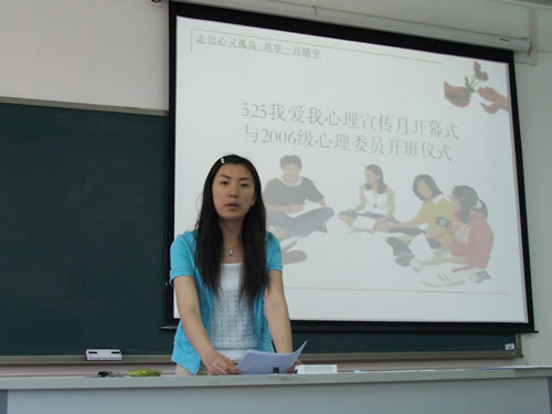 5月16日下午,在7教305举行了首届“525我爱我”心理宣传月活动开幕式暨06级心理委员开班仪式。本次活动由学生事务部心理咨询中心和心理协会主办,beat365心理辅导员涂翠平、团委副书记代鸿滨、学工办副主任赵琼及06级全体心理委员参加了会议。