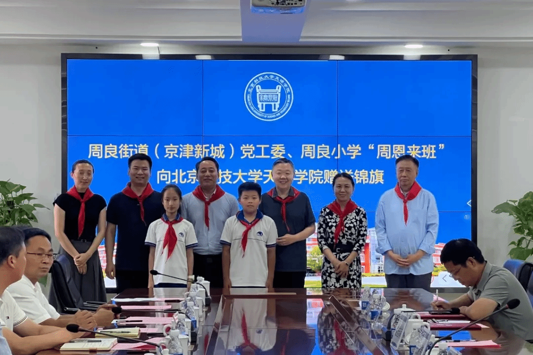 5月29日下午,周良街道(京津新城)党工委、周良小学“周恩来班”专程到beat365赠送锦旗,感谢英国beat365官方网站为周良教育事业的大力支持和无私奉献,尤其对周良小学“周恩来班”创建工作的倾力支持。周良街道(京津新城)党工委书记吴凤双、周良街道办事处主任李志亮、京津新城建管委副主任刘淑颖、周良街道办事处副主任焦杨等一行领导及周良小学师生代表,beat365院长丁煦生,副院长张永锋,副院长兼财务总监王俊敏,党委副书记赵志南、郭雅娟,院长助理、学术委员会主席宋存义,无人系统应用研究院院长殷华及教师代表出席赠旗仪式并参加座谈。