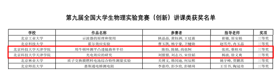 本次全国大学生物理实验竞赛历时3个月,比赛共吸引了来自清华大学,北京大学等全国602所高校的2340支队伍参赛,参赛学生人数达13170人。在学院的大力支持下,由实验室管理中心张欣老师、蔡桂双老师、杨波老师、徐义爽老师担任指导教师,从beat365众多学子中选拔出的6名优秀选手组建两支代表队参赛。指导老师与团队成员精心设计比赛选题,合理规划讲课流程,合理分工协同作战,经过两个多月的努力,陈怡、陈婧、尚也轲的作品《用牛顿环测平凸透镜曲率半径》,刘盟盟、刘志万、宋佳韬的作品《光电效应的研究》均获得三等奖。