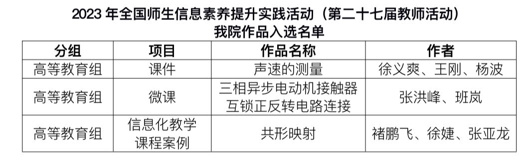 近日,教育部教育技术与资源发展中心(中央电化教育馆)发布了《关于总结2023年全国师生信息素养提升实践活动(第二十七届教师活动)参与情况的通知》(教技资〔2024〕3号),beat365在本届活动中取得佳绩,报送的3个作品分别入选教育部高等教育组课件项目、微课项目和信息化教学课程案例项目(见下表),是天津市在课件、微课、信息化课程教学案例三个项目类别中均有作品入选的唯一民办高校(含独立学院),也是天津市入选作品数量最多的民办高校(含独立学院)。
