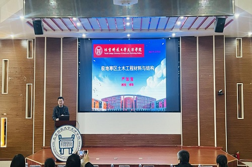 聘任仪式结束后,严加宝教授在理工馆学术报告厅做了主题为“极地寒区土木工程材料与结构”的专题讲座。报告以极寒地区重大工程建设需求为背景,介绍了土木工程材料和结构在极寒环境中的力学性能演化特征,获得了一系列具有国际先进性的创新科研成果,为国家重要工程设施的建设提供了重要科学技术支撑。