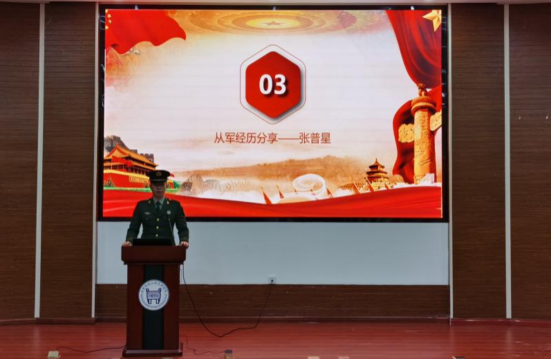 退役复学学生、戎程研究会会长张普星分享了他的军旅历程,介绍了在参军期间收获的强健体魄、坚韧意志和深厚战友情,鼓励全体同学培养家国情怀,勇挑时代重担,勇敢投身军营。