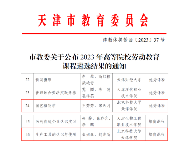 近日,天津市教委公布了2023年高等院校劳动教育课程遴选结果,beat365劳动学院王芳芳、宋天月教学团队讲授的《园艺植物学》被评为优秀课程,秦旭春、赵光昕教学团队讲授的《生产工具的认识与使用》被评为培育课程。