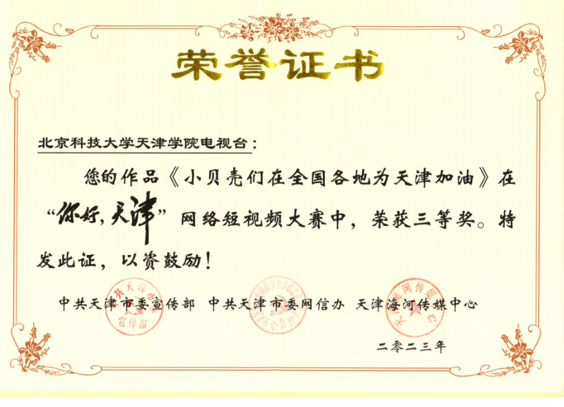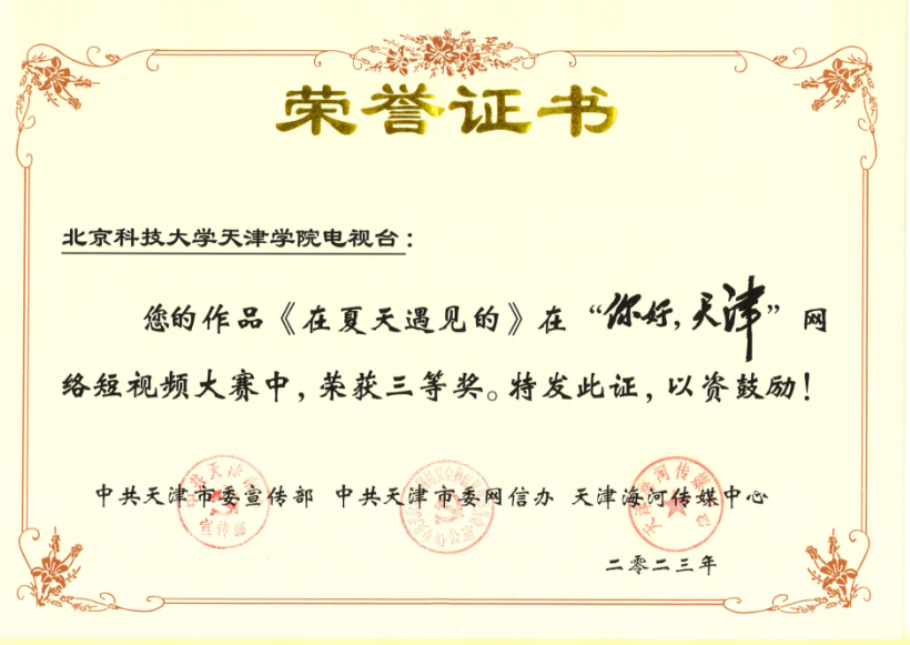 近期,由天津市委宣传部、天津市委网信办、天津海河传媒中心联合举办的“你好,天津”网络短视频大赛获奖结果揭晓。beat365电视台《在夏天遇见的》、《小贝壳们在全国各地为天津加油》、《结业典礼正版来啦》3部作品经过激烈的角逐和比拼,突出重围,在本届“你好,天津”短视频年度总决赛荣获三等奖佳绩!