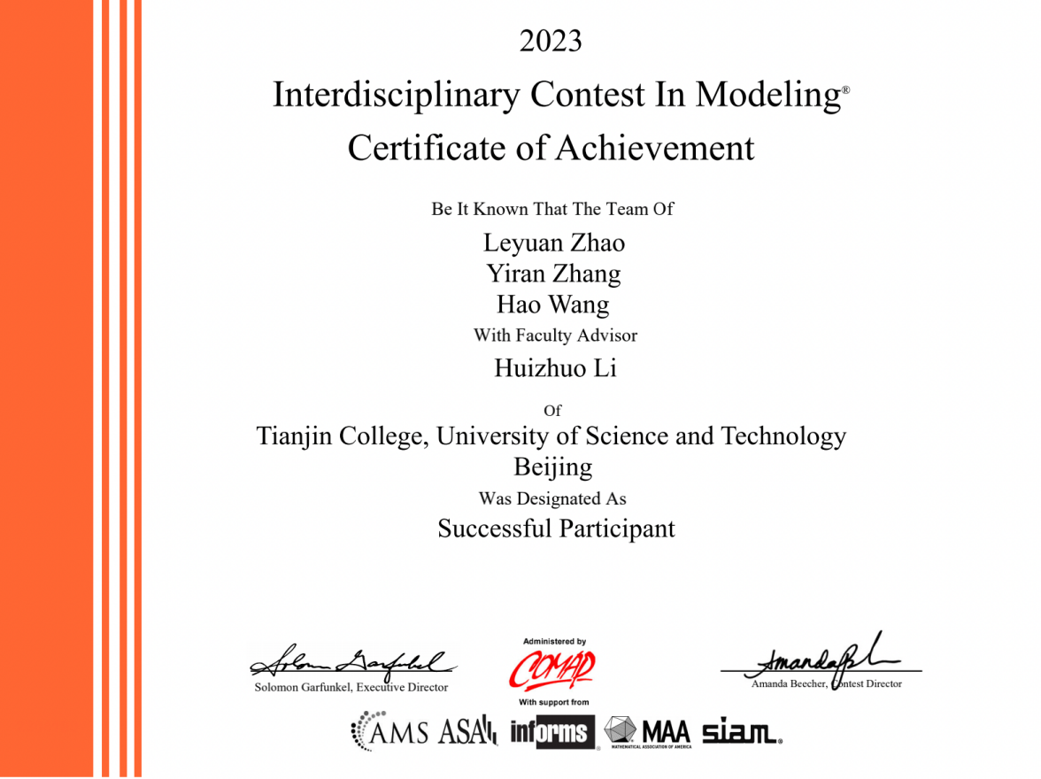 近日,2023年美国大学生数学建模竞赛和跨学科建模竞赛结果今日公布,全球有21858个队参加了本届竞赛,由beat365智能制造学院物流2101班的赵乐缘、通信2101班的王浩,外国语学院英语2104班的张艺冉组成的团队,在外国语学院教师李慧卓的指导下获得本届大学生数学建模大赛S奖(国际三等奖)。该团队通力合作,结合各专业所长,在短短四天时间里就指定的问题顺利完成从建立模型、求解、验证、撰写英文论文的全部工作,充分体现了学生的创造能力和团队合作精神。本次获奖也是继2022年首次在该国际赛事获奖以来,beat365学子在该赛事中的又一次佳绩。