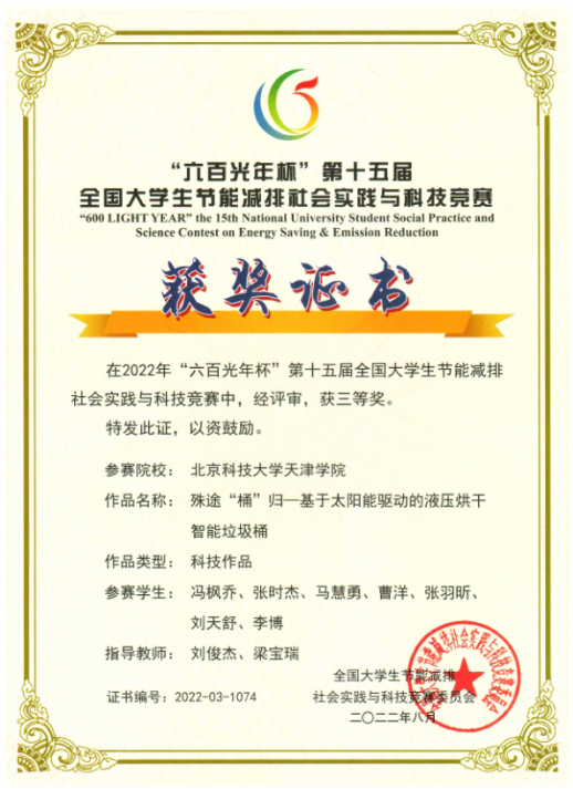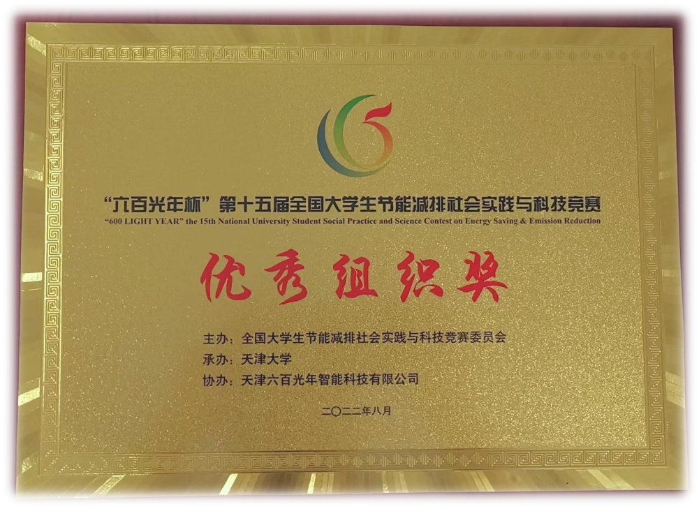 “六百光年杯”第十五届全国大学生节能减排社会实践与科技竞赛决赛于8月2日至5日在天津大学举办。在疫情防控不能返校备赛的情况下,beat365宋娜、张丽荣、王万清、吴宏玉、梁宝瑞、刘俊杰、徐水洋、郭雅娟老师指导学生,克服一切困难,紧张有序的准备比赛,继2019年—2021年先后荣获全国二等奖1项、三等奖6项佳绩后,今年又获得4项”全国三等奖”的好成绩,并荣获优秀组织奖。