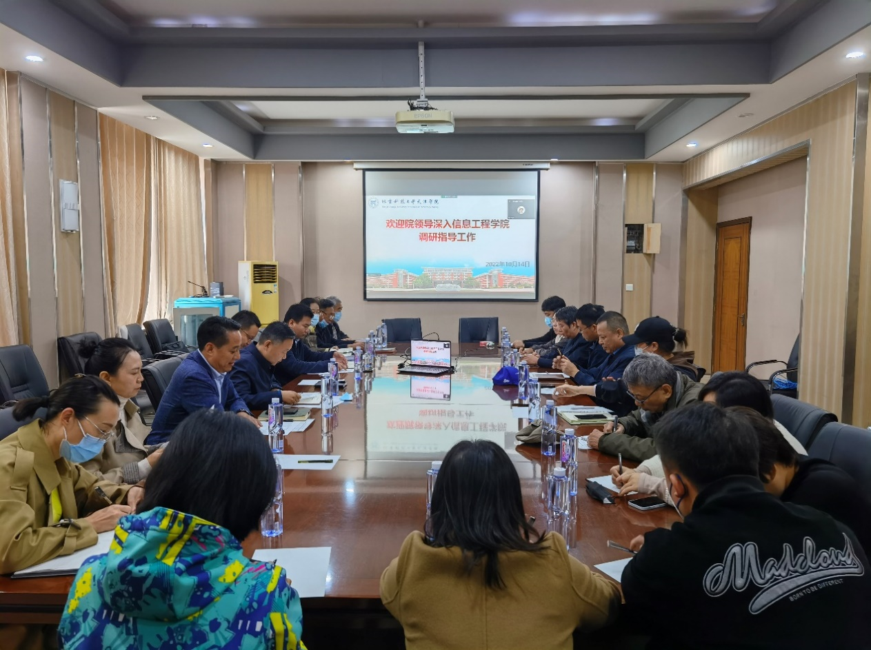 为了进一步深化教育教学改革,推动学院提质发展,10月14日上午,天津学院院长丁煦生、党委书记叶振楠率学院领导班子成员及相关部门负责人一行9人,深入信息工程学院调研指导工作,调研座谈会在行政楼302会议室举办。信息工程学院教师和辅导员代表共计20余人参加了座谈。