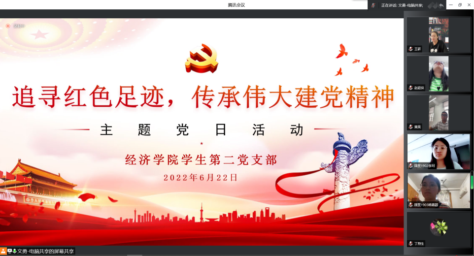 为激励广大党员坚定理想信念,不忘初心、牢记使命,重温党的光辉历史,继承和发扬党的光荣传统和优良作风,进一步增强党的凝聚力和战斗力,6月22日,经济学院学生第二党支部通过腾讯会议线上形式开展2022年第六次组织生活和“追寻红色足迹,传承伟大建党精神”主题党日活动。天津学院院长、党委书记丁煦生与党支部全体师生党员参加,此次活动由党支部书记文勇同志主持。