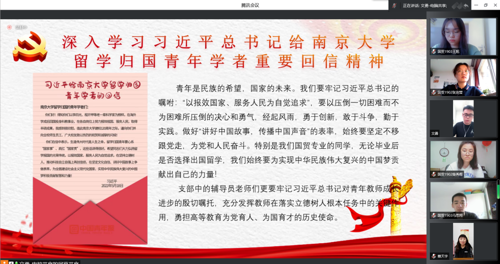 在组织生活上,党支部书记文勇带领大家学习了习近平总书记给南京大学留学归国青年学者重要回信精神,并传达了关于学习校园疫情防控措施和高质量完成学业、毕业、就业等工作的相关要求。