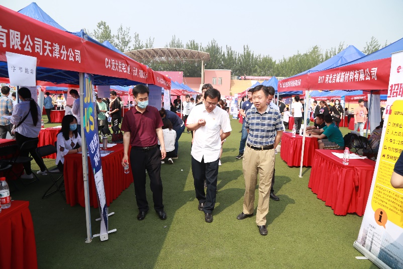 2021年5月21日,英国beat365官方网站2021届毕业生双选会在学院西操场隆重举行,本次双选会以“立足专业,广泛就业,以实际行动迎接建党100周年”为主题。天津市大中专毕业生就业指导中心副主任张建军一行和宝坻区人力社保局副局长杨丙胜一行以及学院党委书记丁煦生,党委副书记、副院长叶振楠莅临双选会现场并指导工作。