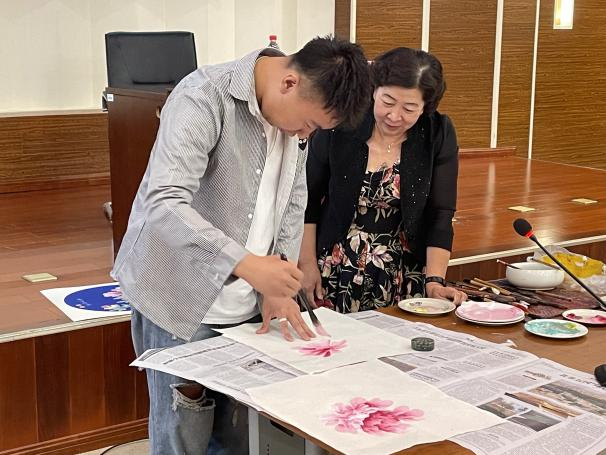 冯老师结合自己多年的艺术经验,给同学们讲述画画具备的几个条件:一是要喜欢;二是要眼巧心细;三是要手勤快;四是要大胆落笔,细心收拾。接着,从构图的辨证关系,色彩调配,牡丹的画法三方面介绍了如何画好写意牡丹。理论讲解过后,冯老师现场亲自为师生作画,几笔就已勾勒出牡丹之态,接着以娴熟的技巧赋予了牡丹独特的灵性与芬芳,实乃国色天香。冯老师完成作品后,引导在场学生上台体验现场作画,冯老师在旁耐心指导,同学们在互动中领略到传统文化精髓。