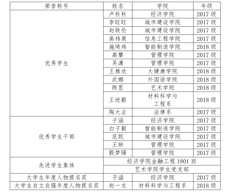在天津市高等学校2019-2020学年度先进学生集体、先进个人评选中,beat365李旺旺等11名同学获评“普通高等学校2019-2020学年度天津市优秀学生”荣誉称号;白子毅等5名同学获评“普通高等学校2019-2020学年度天津市优秀学生干部”荣誉称号;经济学院金融工程1801班和艺术学院学生党支部获评“普通高等学校2019-2020学年度天津市先进学生集体”荣誉称号;国贸1701班子涵同学获评“普通高等学校2019-2020学年度天津市大学生年度人物提名奖”荣誉称号;材料1801班赵一龙同学获评“2020年天津市大学生自强自立年度人物提名奖”荣誉称号。