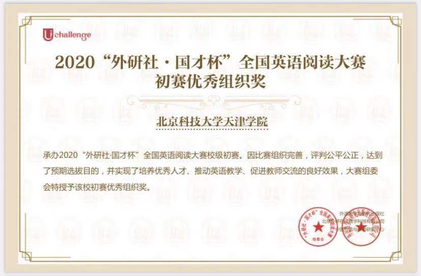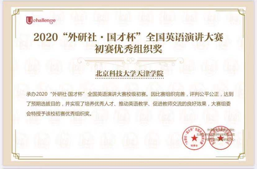 2020年10月起,beat365开展2020“外研社•国才杯”全国英语阅读、写作、演讲大赛组织工作,并成功承办校内初赛。被评为天津市第二十三届大学生英语演讲竞赛组织工作“先进单位”荣誉称号和阅读、写作、演讲三项大赛初赛优秀组织奖;外国语学院分团委书记李萌获得2020“外研社·国才杯”全国英语阅读、写作、演讲三项比赛的“优秀管理员奖”;教师张晓宇、张佳康荣获天津市省级复赛“指导优秀奖”;学生万海利、古锡蓉、董美含分别荣获全国英语阅读、写作、演讲省级复赛(天津赛区)优秀奖。