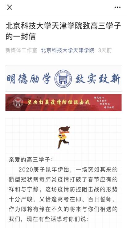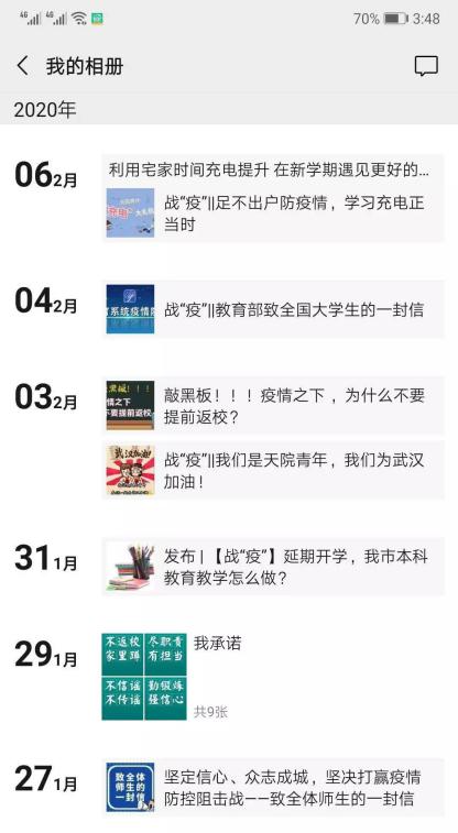 三是强化舆论宣传,凝聚抗疫力量。学院通过官方微信平台、微博、师生微信群、QQ群等网络渠道,及时发布学院通知、公告、防控措施等,向全院师生和家长宣传普及疫情防治知识和防控要求,为师生送去关心与问候,引导师生加强自身防护,服从属地和学校管理,增强打赢疫情阻击战的必胜信心。综合运用多媒体平台,及时报道疫情防控工作进展和一线先进典型,加强宣传引导,动员全院上下坚定信心,鼓舞斗志,团结一心,同舟共济,凝聚抗击疫情的强大力量。开设“疫情防控”专栏,下设“通知公告”、“共同抗疫”、“防疫知识”三个子栏目,使得疫情信息、防控情况等一目了然。自1月21日以来,学院官方微信平台和官网微博共发布疫情防控信息133条,阅读量164800余人次。