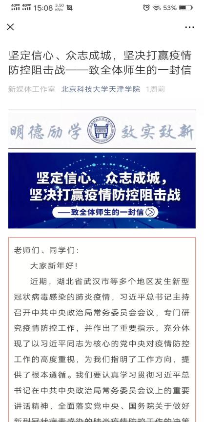 五是强化学生工作,提振战疫信心。学院充分发挥学生工作者深入学生一线的工作优势,将“面对面”转为“键对键”,由“线下”转到“网上”,坚持把学生生命安全和身体健康放在第一位,全面落实疫情防控工作。按照“全覆盖、底数清、情况明”的工作要求,全体辅导员第一时间进入战斗状态,深入排查当前在湖北师生情况、师生前往湖北地区情况、接触来自湖北地区人员情况,以及外地留津学生情况等,建立工作台账,全面梳理10305名学生的具体情况,为疫情防控工作打下坚实基础。实行学生信息动态管理,密切关注身处湖北以及发热、隔离观察等特殊状况学生,实时上报信息变化,及时更新相关数据。建立畅通的信息报送和每日联系学生工作机制,每天点对点联系学生,统计疫情防控相关数据,确保“全覆盖、无死角、不遗漏”。积极引导学生不信谣、不传谣、不造谣,遵守学校规则,不提前返校,进行线上安全教育,指导学生合理安排假期,提振学生战胜疫情的信心和勇气。