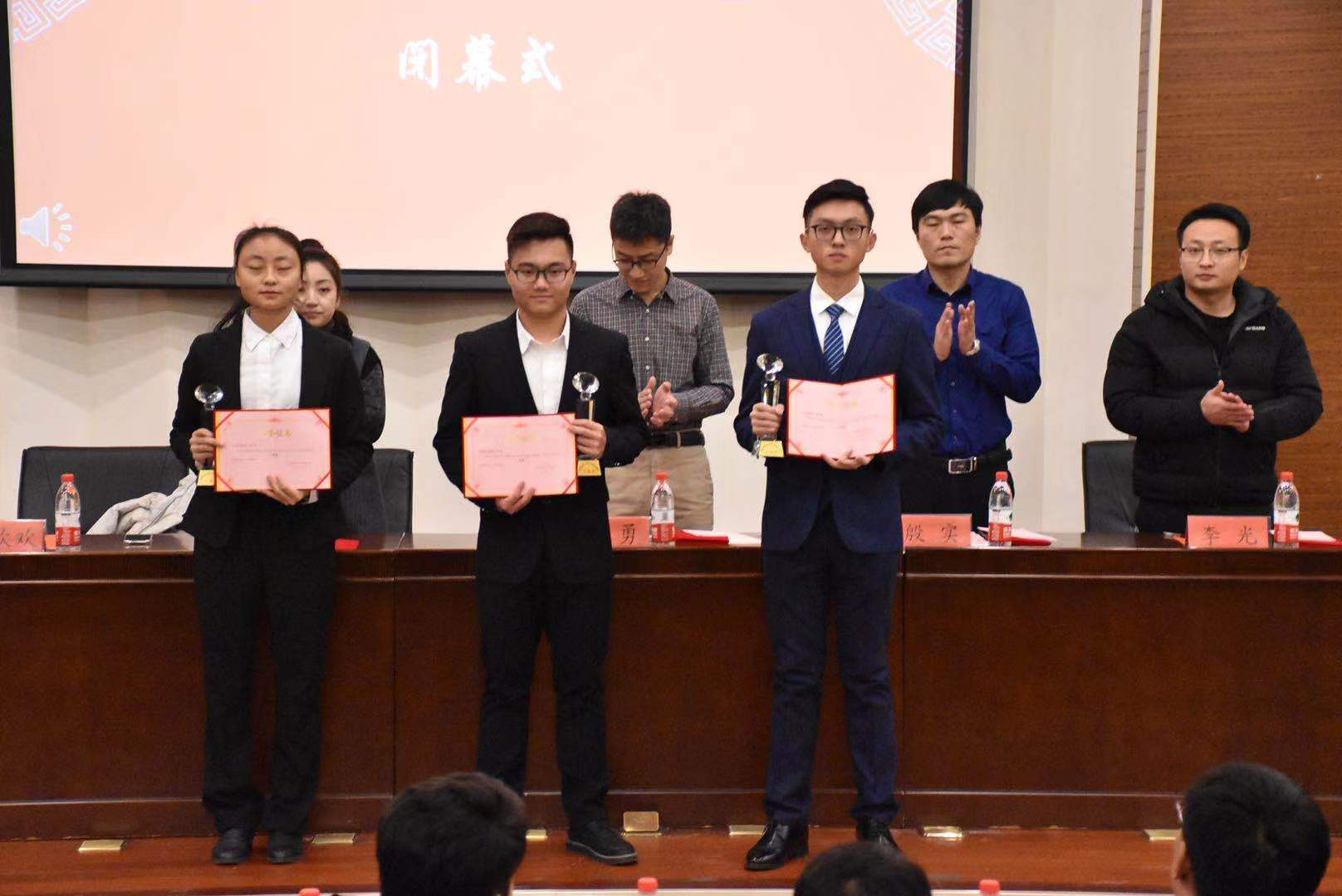 随后,团委书记殷实老师公布了传统文化艺术节中活动获奖名单,其中获奖情况为,国学知识竞赛冠军:无言以队、亚军:浮生若梦队、季军:青云志队、优秀奖:千枫星雪新媒体队、最佳个人奖:王硕, “爱要大声说出来”孝心班会成果展一等奖:经济学院国贸1903班、二等奖:法律系法学1904班、三等奖:艺术学院音表1902班。2019年“孝心社优秀分社长”李文辉、郭婉娣、何苏恒、张思怡、陈琴梅、王子恒、杨寒希、钱瑞、温靖庭。并进行了颁奖仪式。
